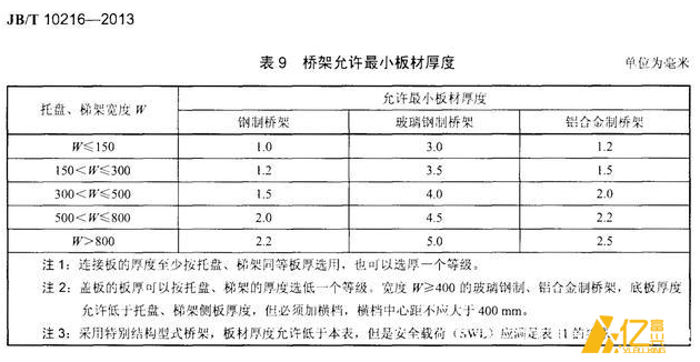 根據《鋼制電纜橋架工程技術規程》編號:T/CECS31-2017-3.5.5章規定,熱浸鋅橋架厚度標準參考如下: